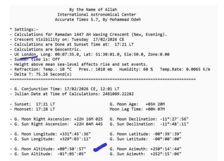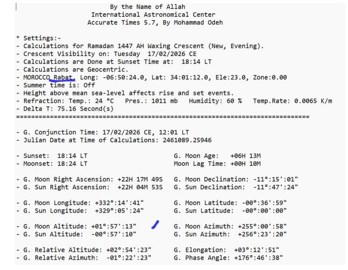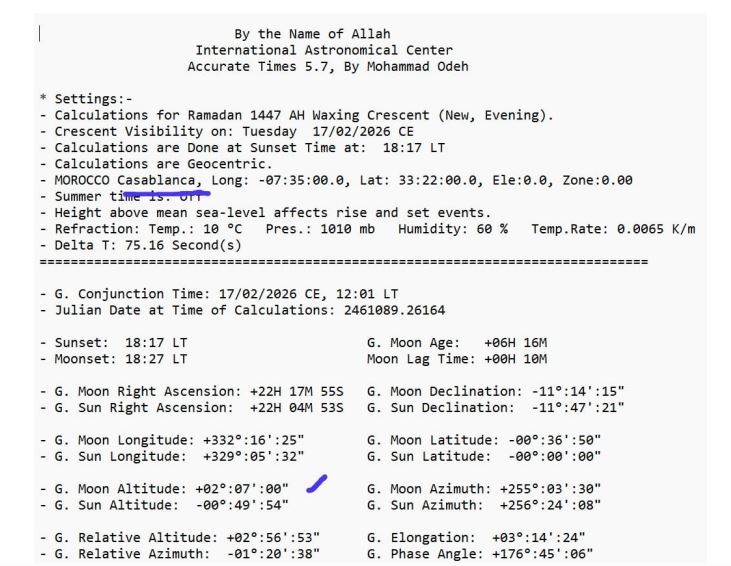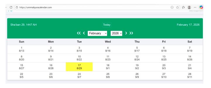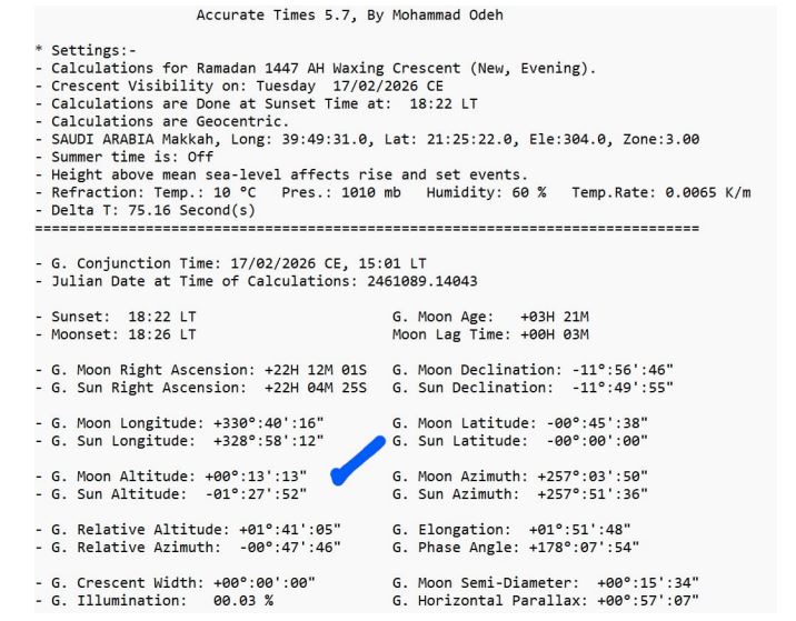 1. Di Langit Ka'bah (Mekkah): Data menunjukkan bahwa di Mekkah, Matahari terbenam pada pukul 18:22 waktu setempat, sedangkan Bulan terbenam pada 18:26. Artinya, hilal sudah wujud di atas ufuk dengan ketinggian +00° 13' 13". Meski tipis, secara astronomis bulan sudah berada di atas ufuk setelah matahari terbenam. Ini memenuhi kriteria masuknya bulan baru dalam sistem kalender Ummul Quro. Dalam kalender resmi Arab Saudi sendiri, 1 Ramadan 1447 ditulis jatuh pada tanggal 18 Februari 2026.
